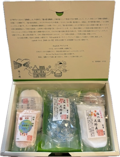 当店の『莨屋塩座のご贈答セット』は、御贔屓いただいています足助直しの3トリオを詰め合わせた特別なセットです。各種の塩は、厳選された国産の海塩を使用し、塩のえぐみを整えたまろやかな風味を実現しています。